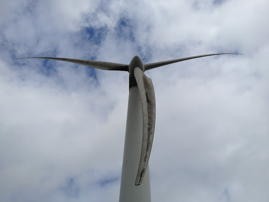 I knew there was a large wind farm on top, but despite the amount of walking I'd now done in mid-Wales I'd never been very close to one. The turbines were all well away from the hill edge so at just 100ft from the top I still couldn't see or hear them. Then they all seemed to appear together, and it was a very impressive sight. There were 18 enormous turbines spread out over the space of about two miles, and I walked most of its length. Two were broken and looked quite sad compared to the others. The path went within 50 yards of the majority of them so I wandered over to the nearest one. Standing directly beneath the blades was a combination of awe-inspiring and terrifying! There was a door on the back which said, 'Danger of Death, 33,000 volts. Sadly it was locked as I could have done with charging my phone.
